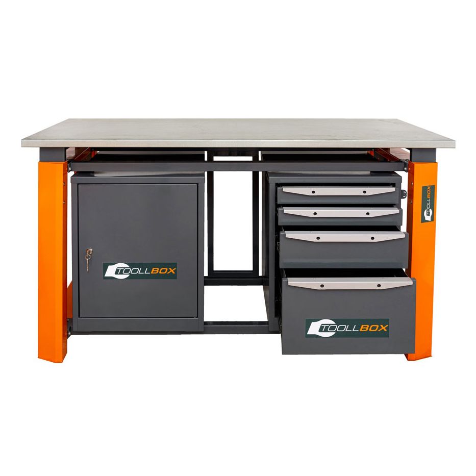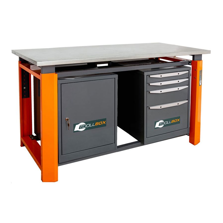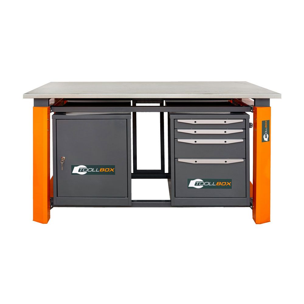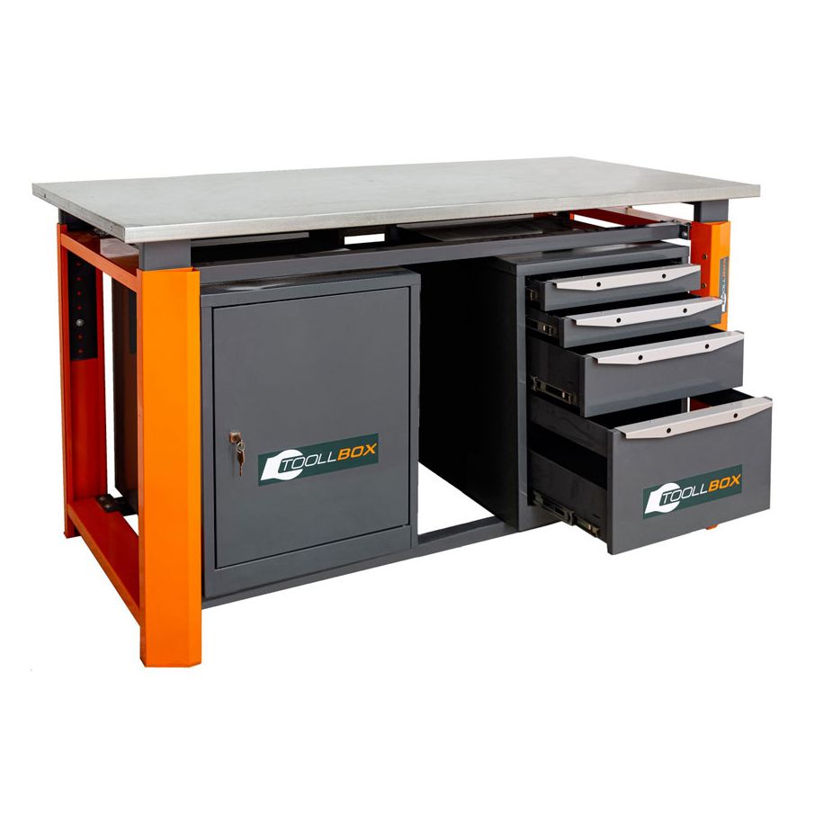 Верстак ТВР1800 (ТВ0-ТВ4) — это основательное рабочее место для мастерской, сервиса, цеха или гаража, где важны не только прочность, но и удобная организация инструмента и расходных материалов. Модель выполнена в двухтумбовой комбинированной компоновке: с одной стороны расположена тумба с четырьмя выдвижными ящиками, с другой — тумба с дверцей и двумя полками. Такая конструкция позволяет держать под рукой и мелкую оснастку, и более габаритные вещи, не перегружая рабочую поверхность.